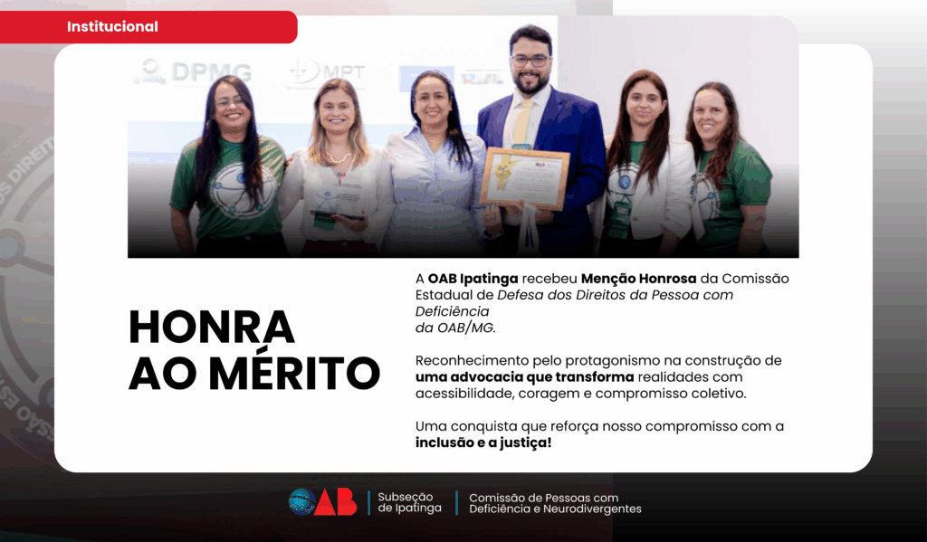 A OAB Ipatinga recebeu Menção Honrosa da Comissão Estadual de Defesa dos Direitos da Pessoa com Deficiência da OAB/MG.